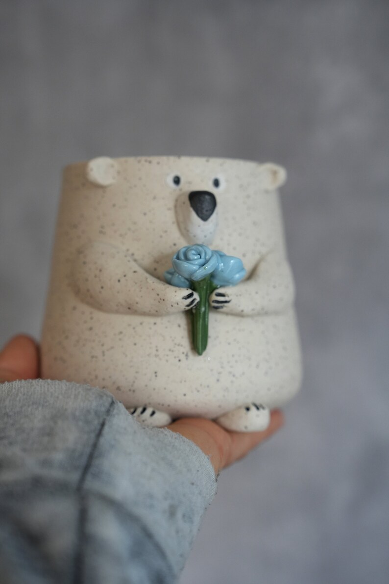 Truffles the bear loves to smell the roses. Made to order mug, which I will handcraft start to finish for you. Light grey speckled stoneware, white food safe inner glaze. Holds 14-16 oz. Microwave safe, dishwasher top shelf possibly safe away from moving pieces, though hand wash is recommended to protect the roses. Designed, wheelthrown,... Read More