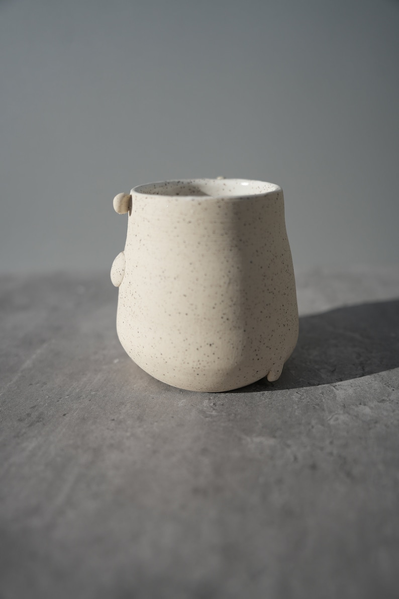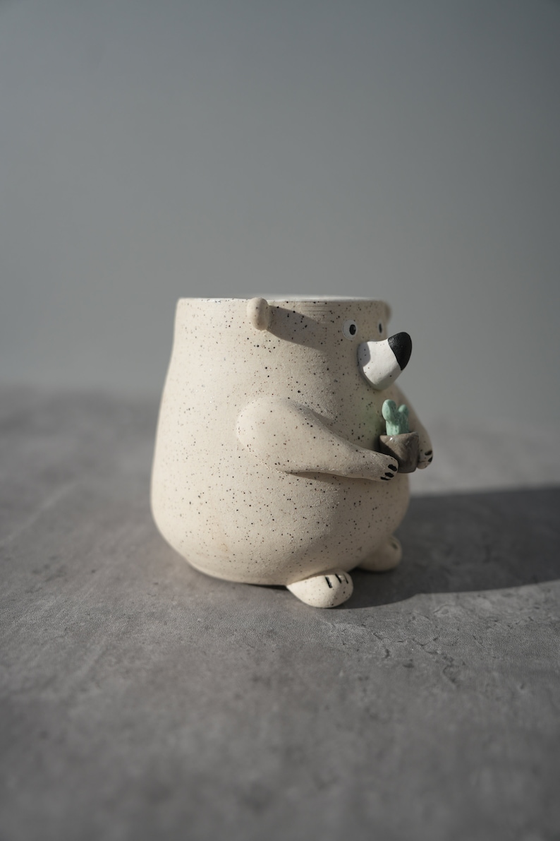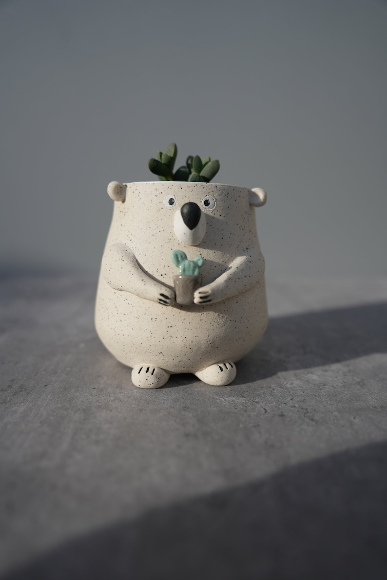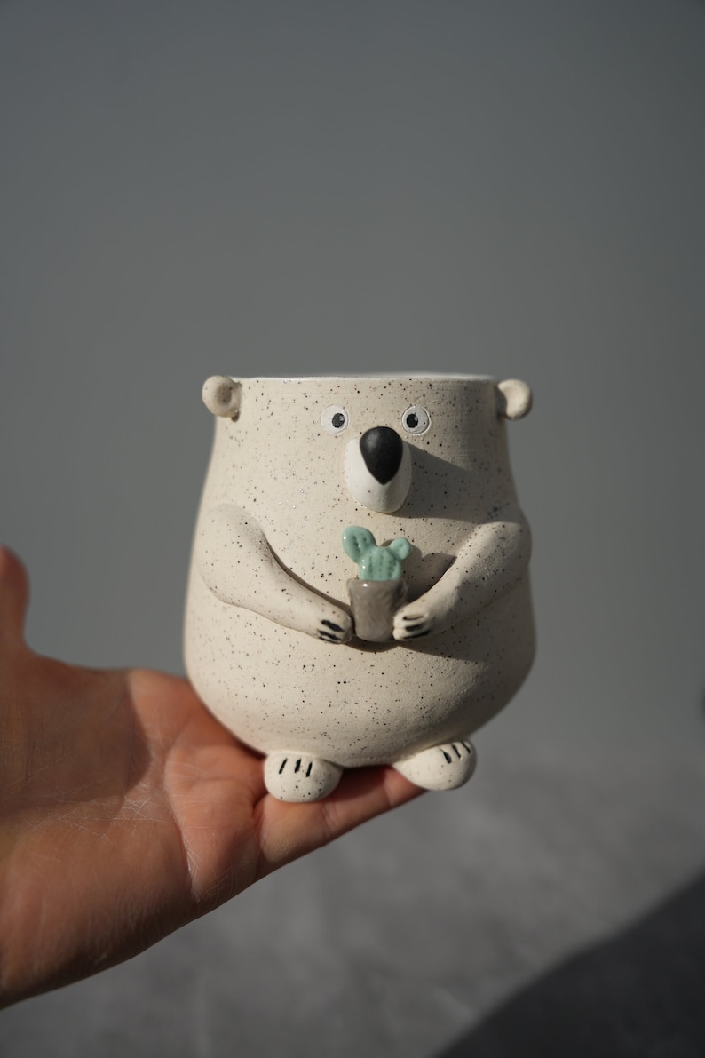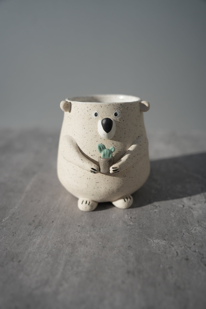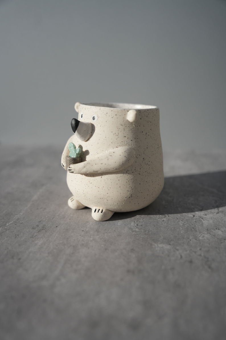 Truffles the bear loves to cultivate succulents. Can be used as drinking cup, bud vase, or planter, holding 16 oz. Made of durable speckled stoneware clay, with white food safe inner glaze. And as each one is handmade by me, there may be very small variations. Live plant not included.