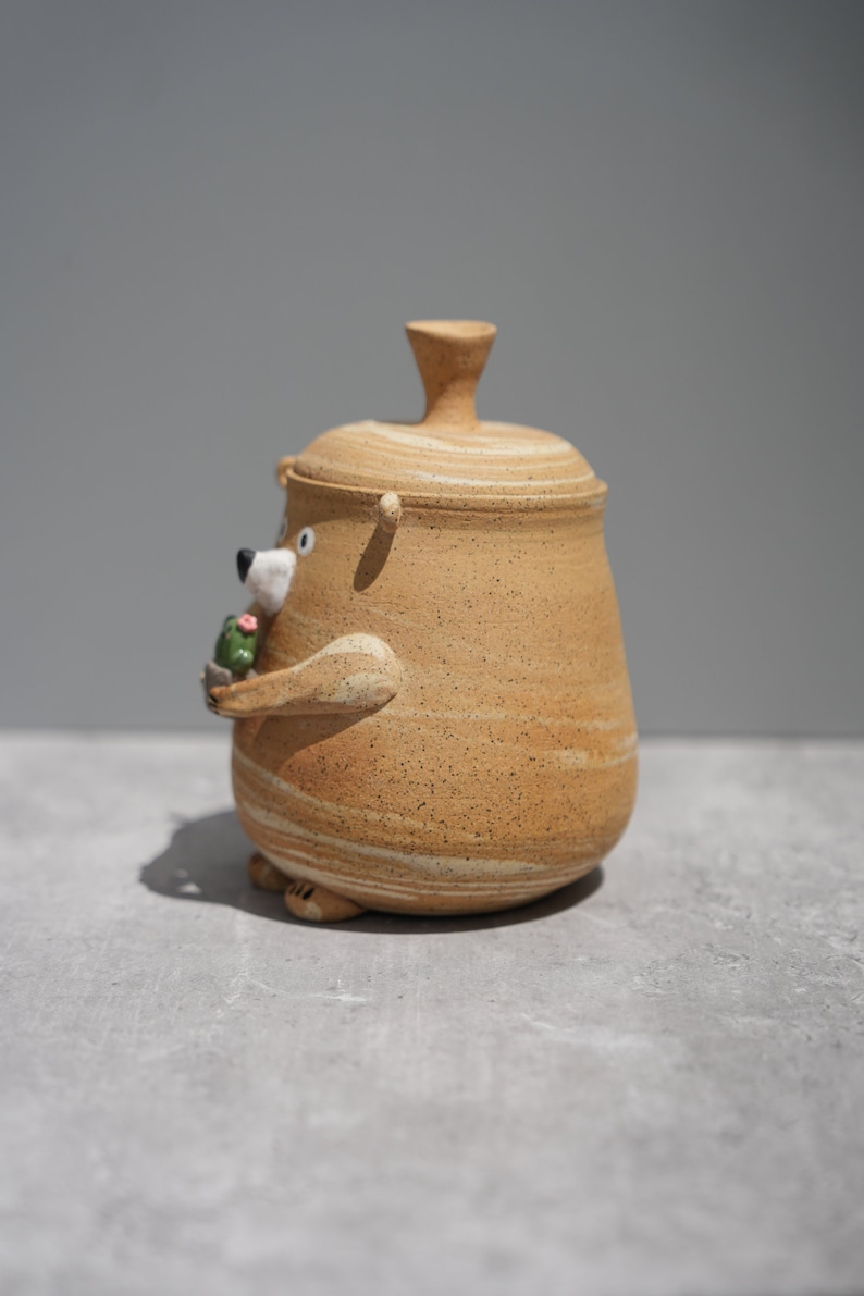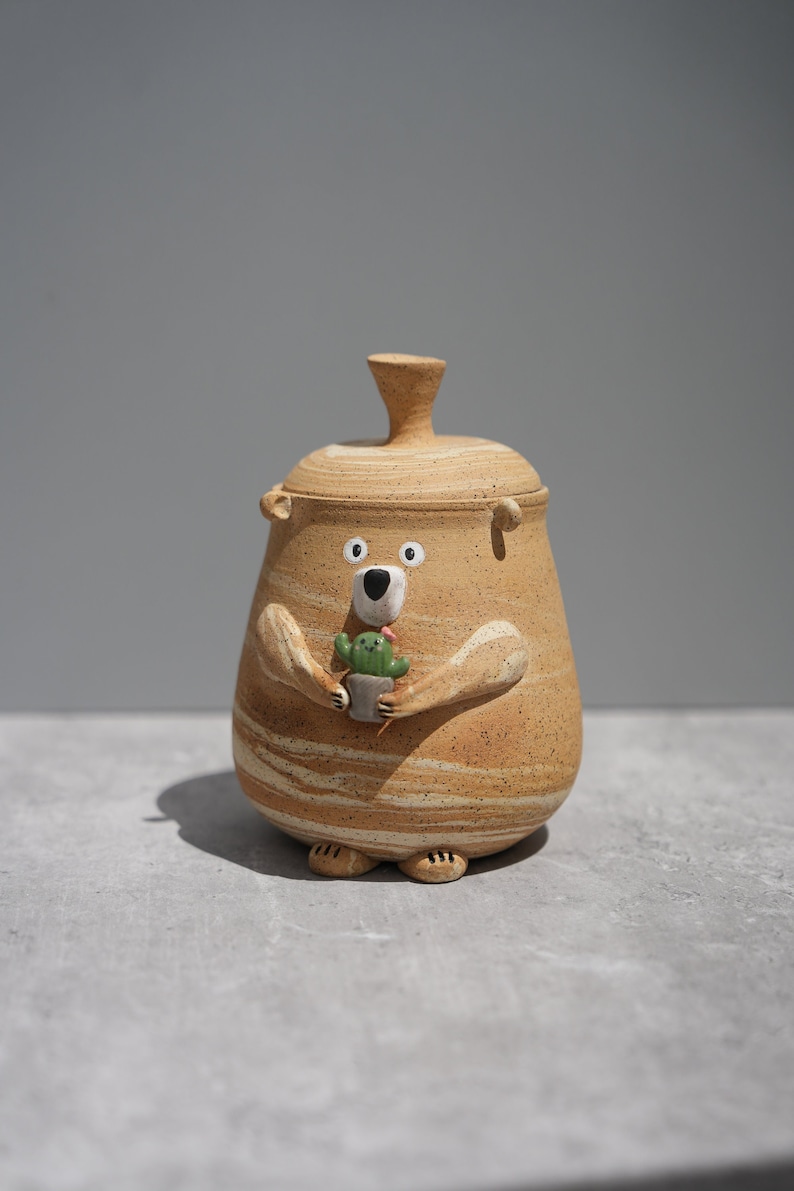 Truffles the bear holding a potted cactus friend. Hand mixed marbled stoneware clay, sanded to silky smoothness; fresh white food safe glaze on the inside. Holds 24 oz. Designed, wheelthrown, and glazed by me.